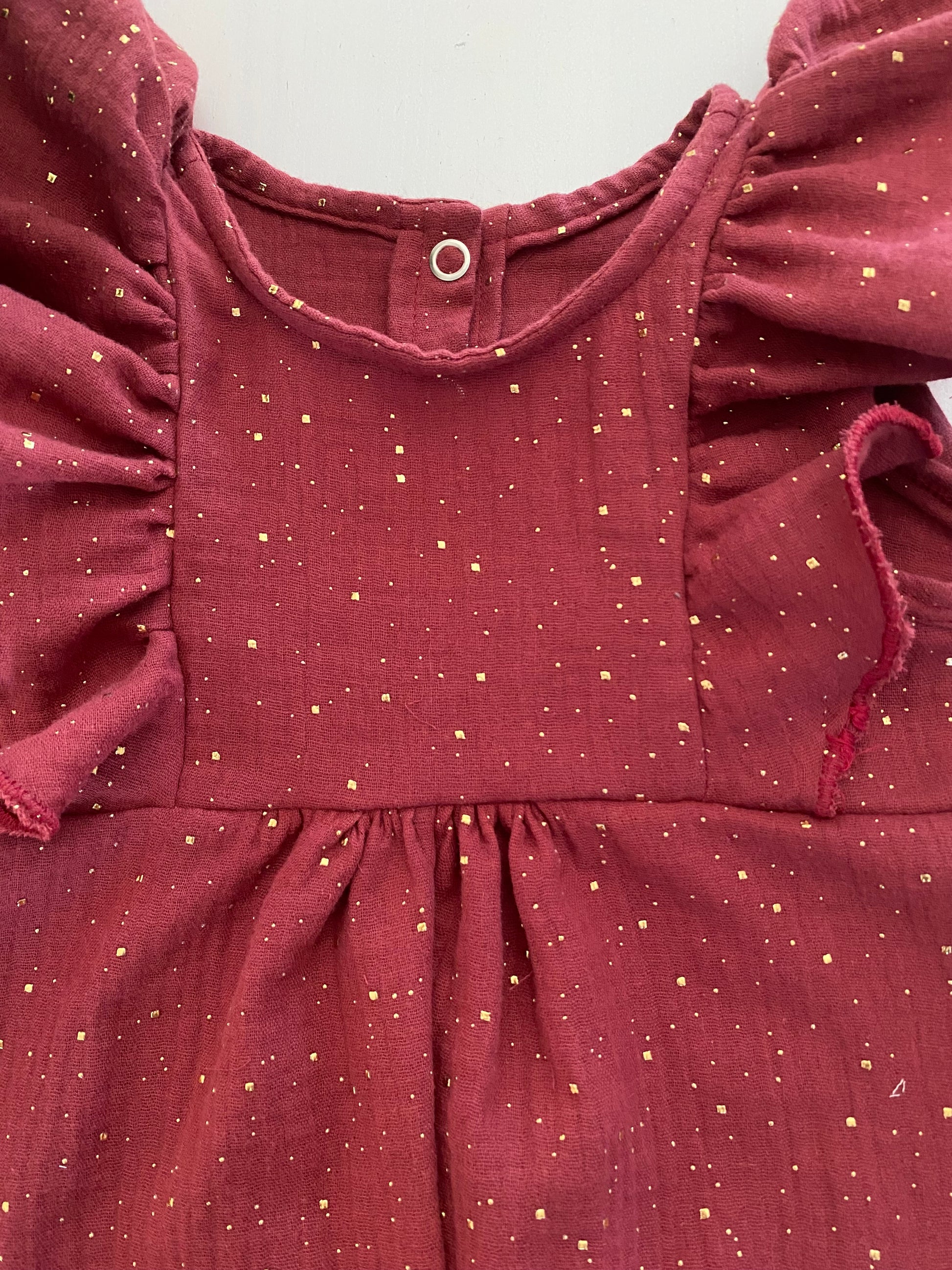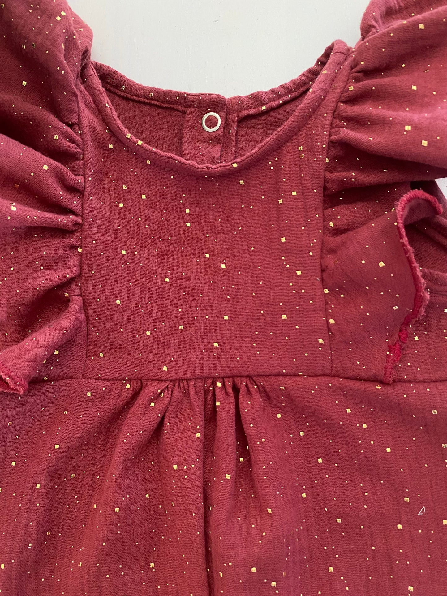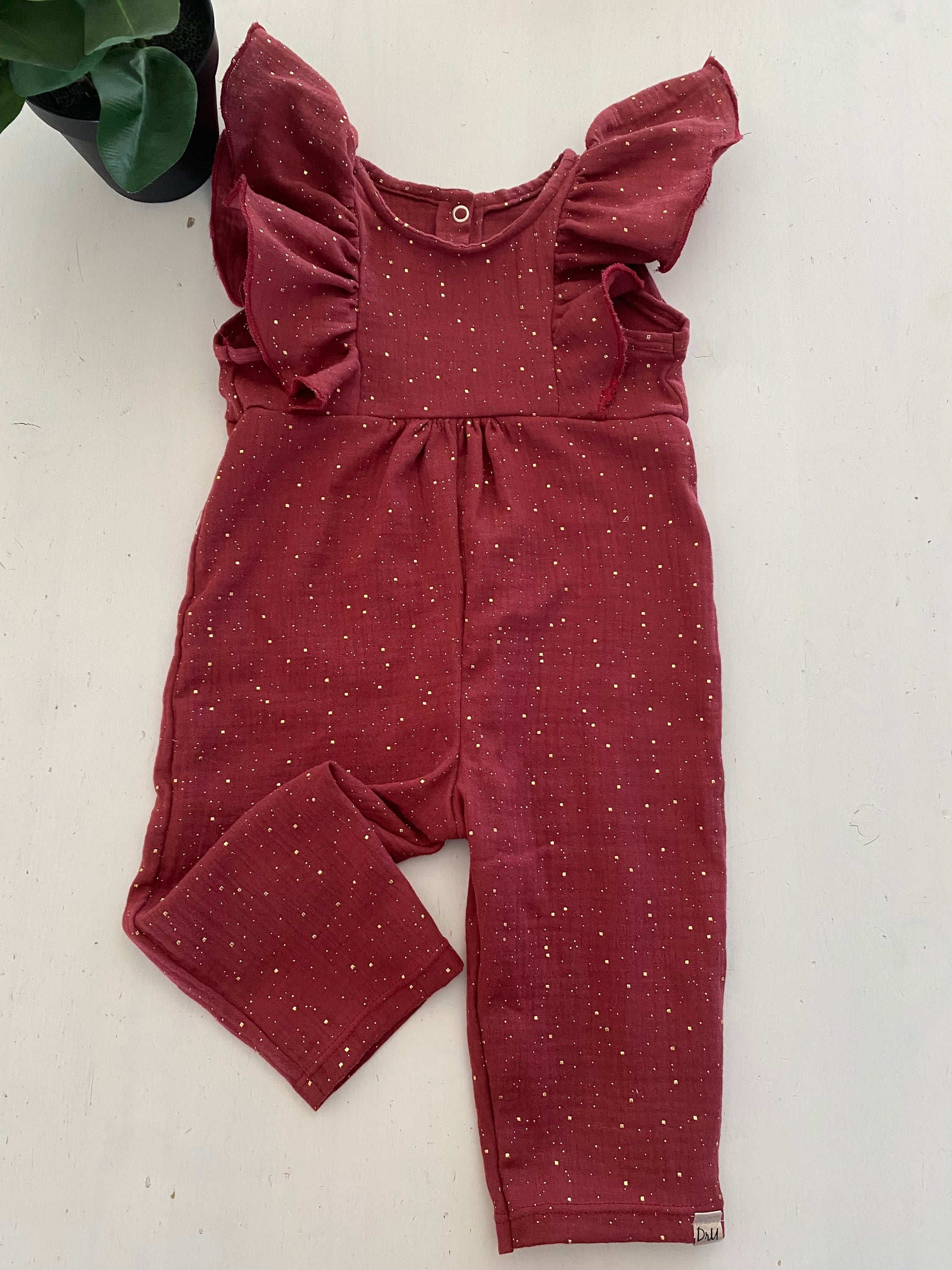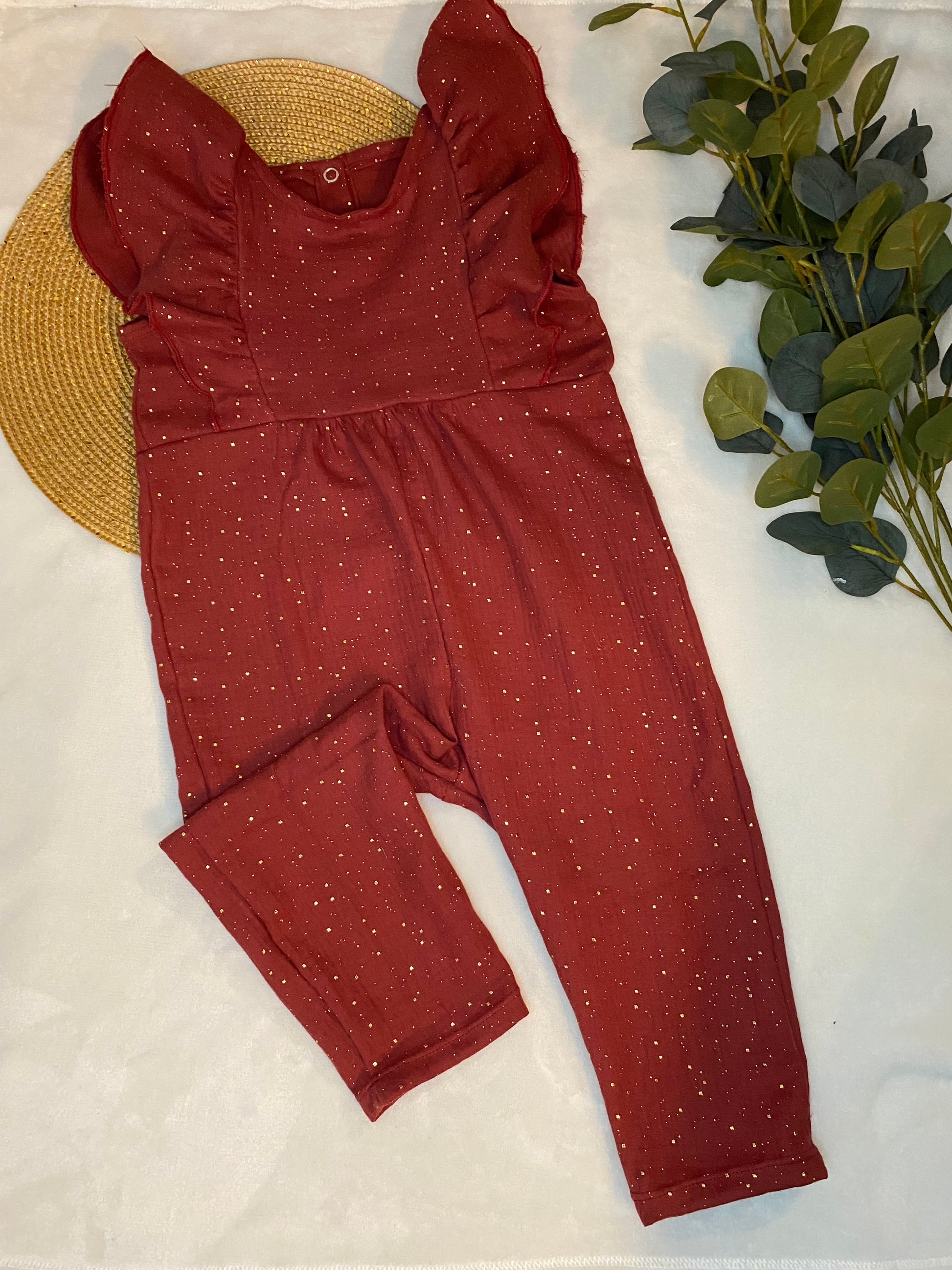 Deze handgemaakte meisjes jumpsuit is pure magie in stof! Gemaakt van luchtige, zachte hydrofiele stof in een warme terracotta kleur, straalt dit pakje warmte en vrolijkheid uit. De subtiele gouden glitters zorgen voor een fonkelend effect bij elke beweging – alsof je kleine sterretje zelf straalt! De speelse rushes aan de schoudertjes maken het extra lief en charmant. Perfect voor zonnige dagen, feestjes of gewoon om in te stralen – dit jumpsuitje is een echte eyecatcher met een knusse knuffelfactor! ✨