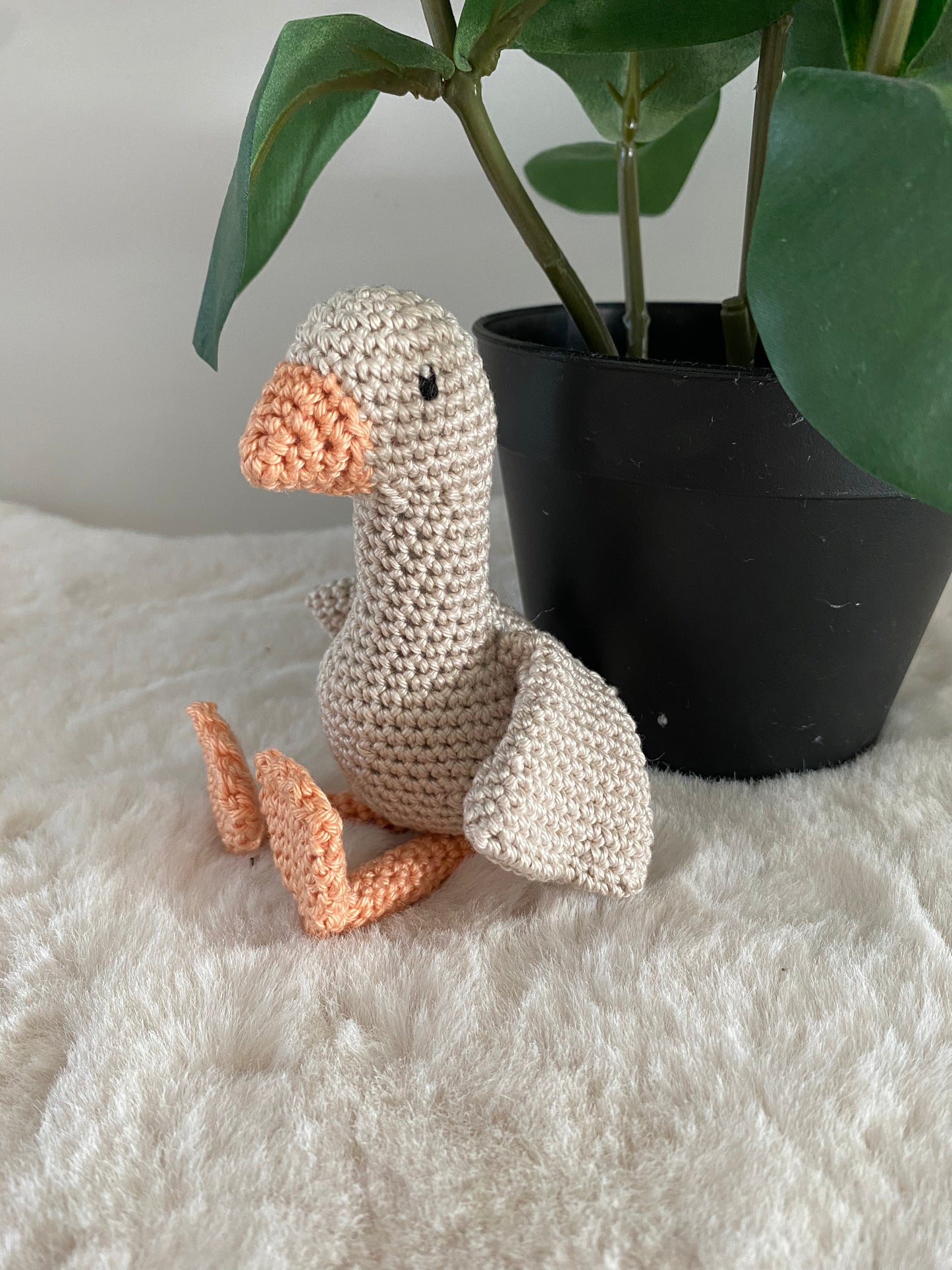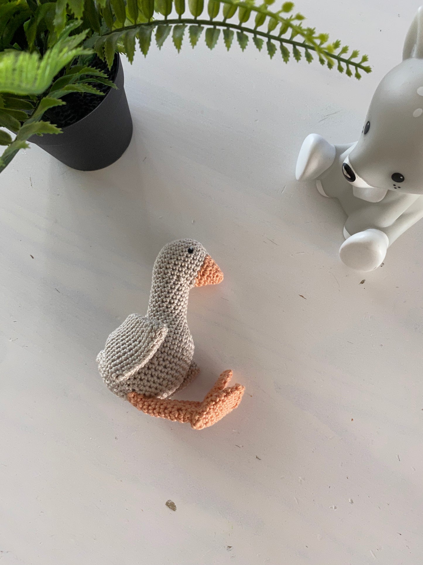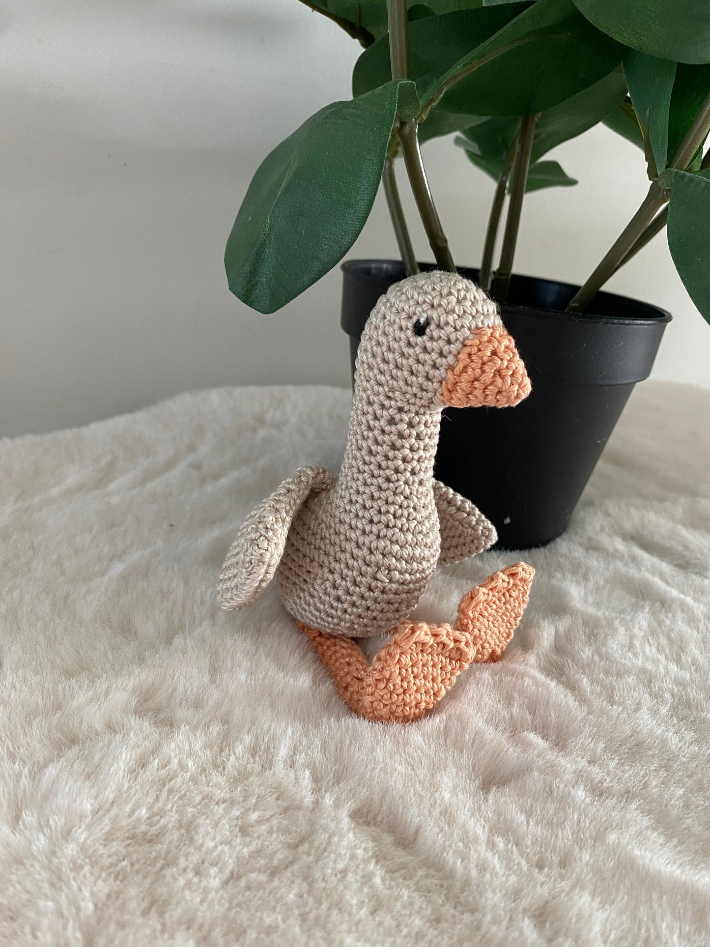 Dit super schattige gehaakte gansje is een knuffelvriendje om verliefd op te worden! Met zijn zachte ecru katoenen garen en lieve details is dit gansje perfect om mee te knuffelen en overal mee naartoe te nemen. Een trouwe vriend voor de allerkleinsten, die gegarandeerd voor veel glimlachjes zorgt!