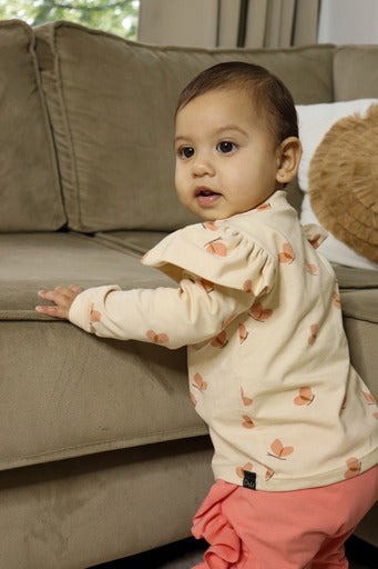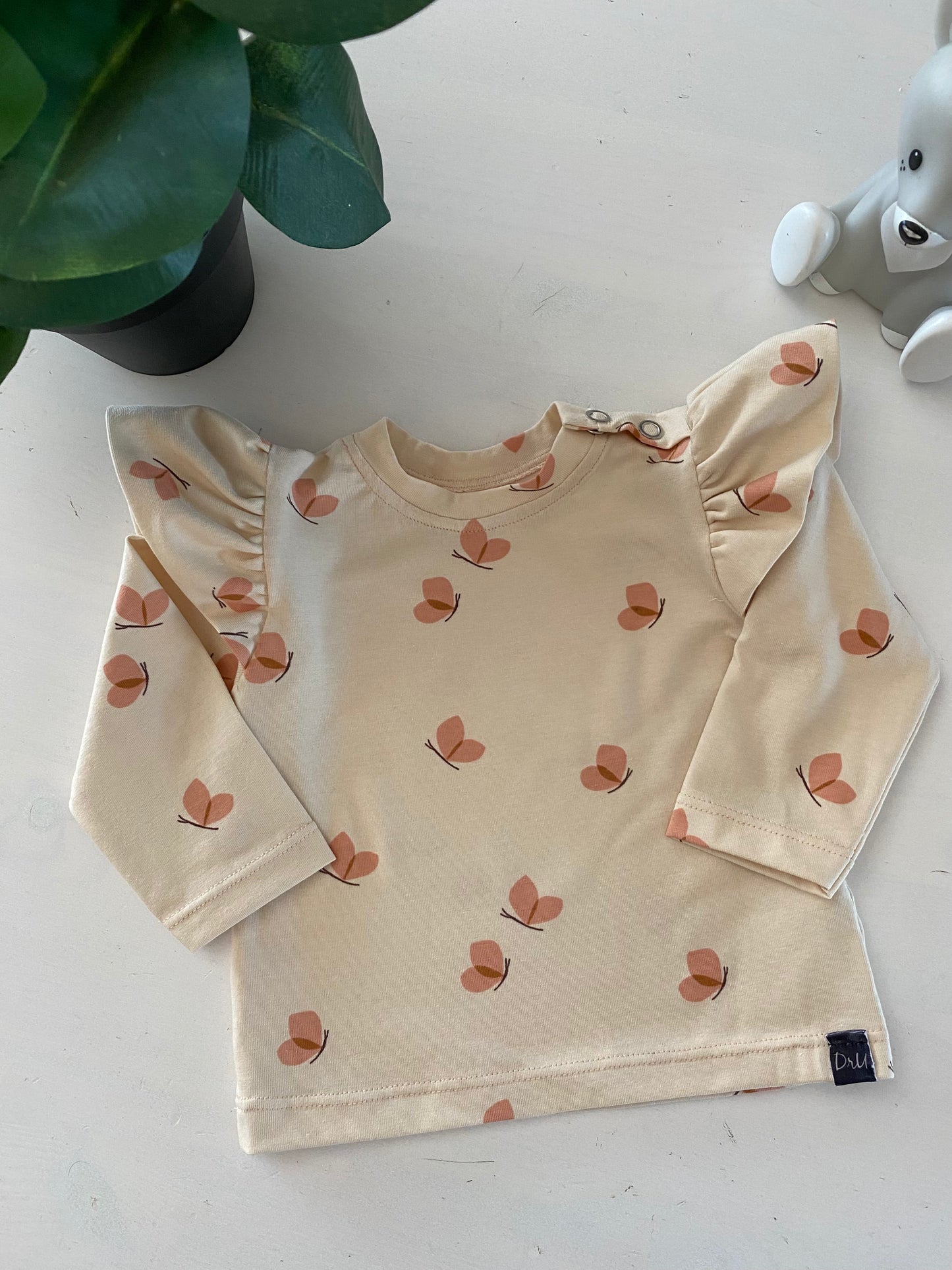 Deze schattige, handgemaakte baby longsleeve is een echt juweeltje voor je kleintje! Gemaakt van superzacht katoen tricot, voelt het heerlijk comfortabel aan op de tere huid van je baby. De longsleeve is versierd met delicate roze vlindertjes, die zorgen voor een lieflijke en speelse uitstraling. De subtiele rushes aan de schouders geven het shirtje een extra schattige touch en maken het perfect voor zowel dagelijks gebruik als speciale gelegenheden. Met dit shirtje ziet je kleine meid er niet alleen ontzettend schattig uit, maar zit ze ook heerlijk comfortabel!
