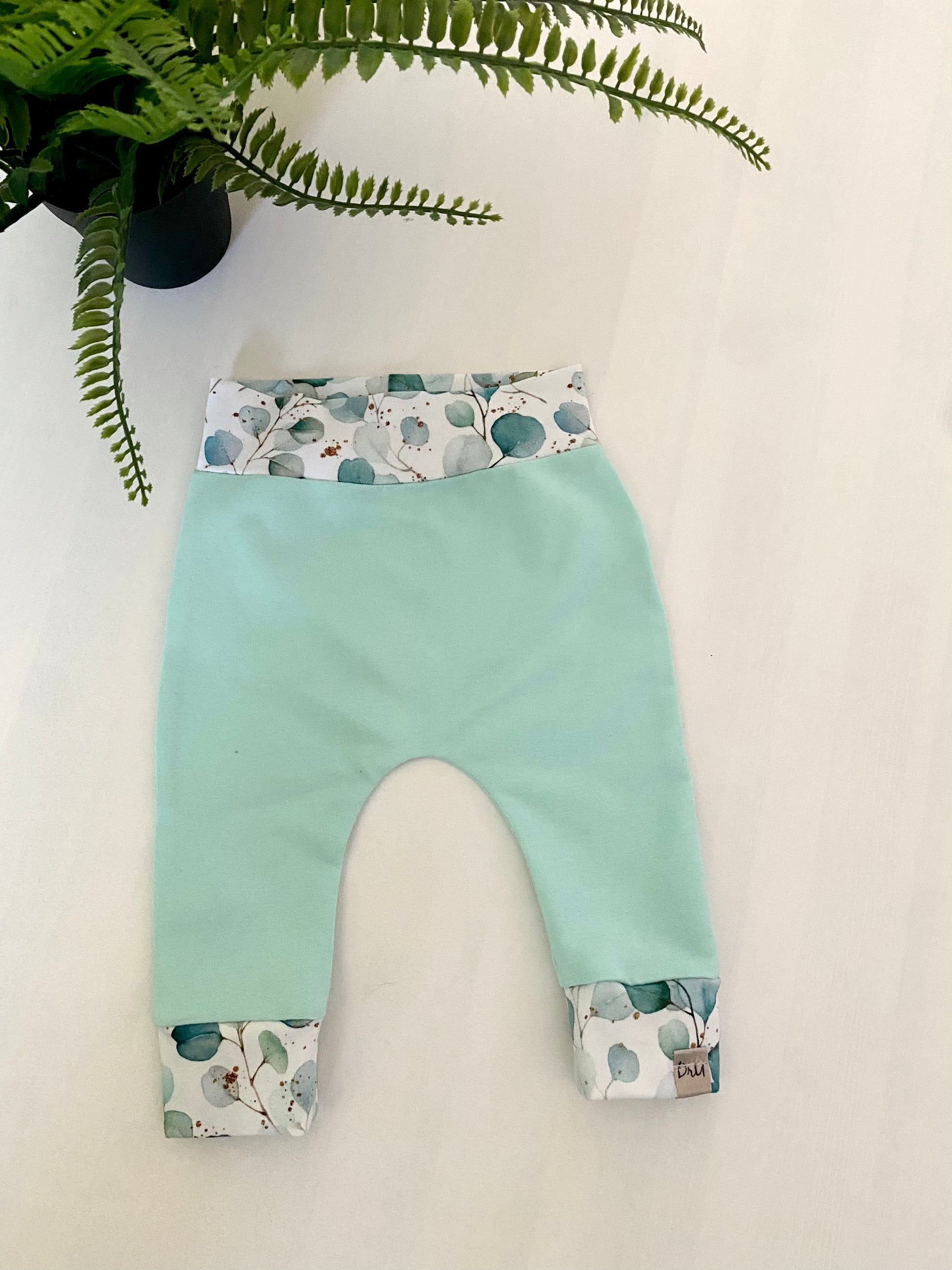 Dit schattige newborn broekje is een echt pareltje voor de kleintjes. Gemaakt in een zachte licht mintblauwe kleur straalt het rust en frisheid uit. De lieve boordjes zijn bedrukt met sierlijke eucalyptus blaadjes en takjes, wat een natuurlijk en dromerig accent toevoegt. Het broekje voelt heerlijk zacht en comfortabel aan, perfect om in te slapen, te spelen of gewoon knus bij mama en papa te liggen. Een schattig en stijlvol broekje waarin je kleintje zich helemaal geborgen voelt!