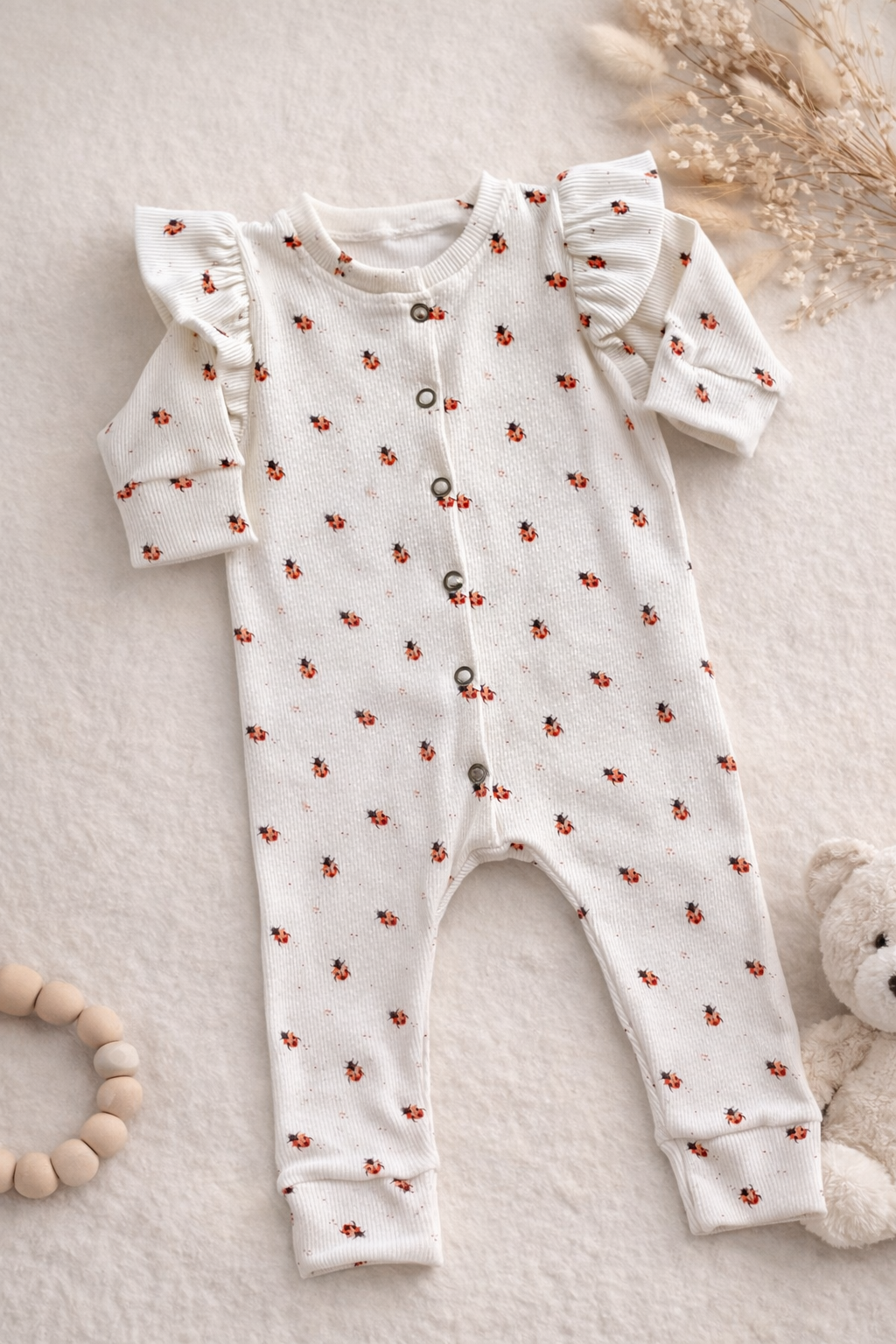 Dit boxpakje is gemaakt uit zachte witte ribstof en bedrukt met fijne, kleine lieveheersbeestjes voor een extra lieve uitstraling. De speelse rushes aan de schouders geven het pakje een romantisch en verfijnd accent. Perfect om jouw babymeisje comfortabel én stijlvol te laten stralen.