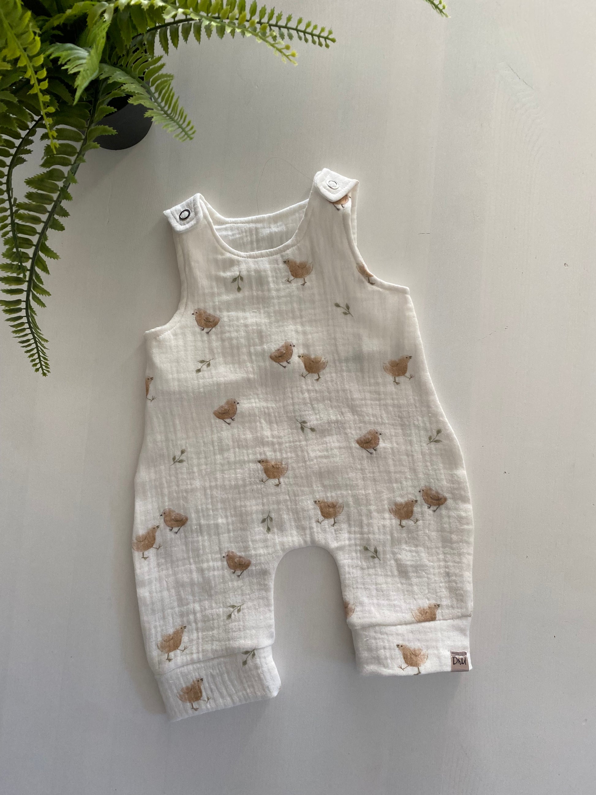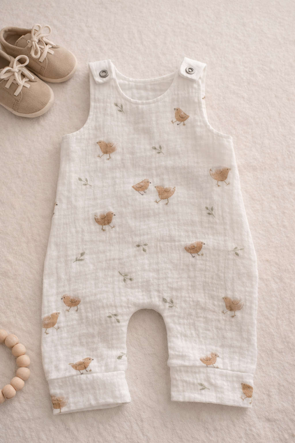 Dit lieve handgemaakte tuinbroekje is een echte blikvanger voor je kleintje. Het is gemaakt uit een zachte witte hydrofiele stof en bedrukt met kleine, schattige bruine vogeltjes die voor een speelse en natuurlijke uitstraling zorgen.
