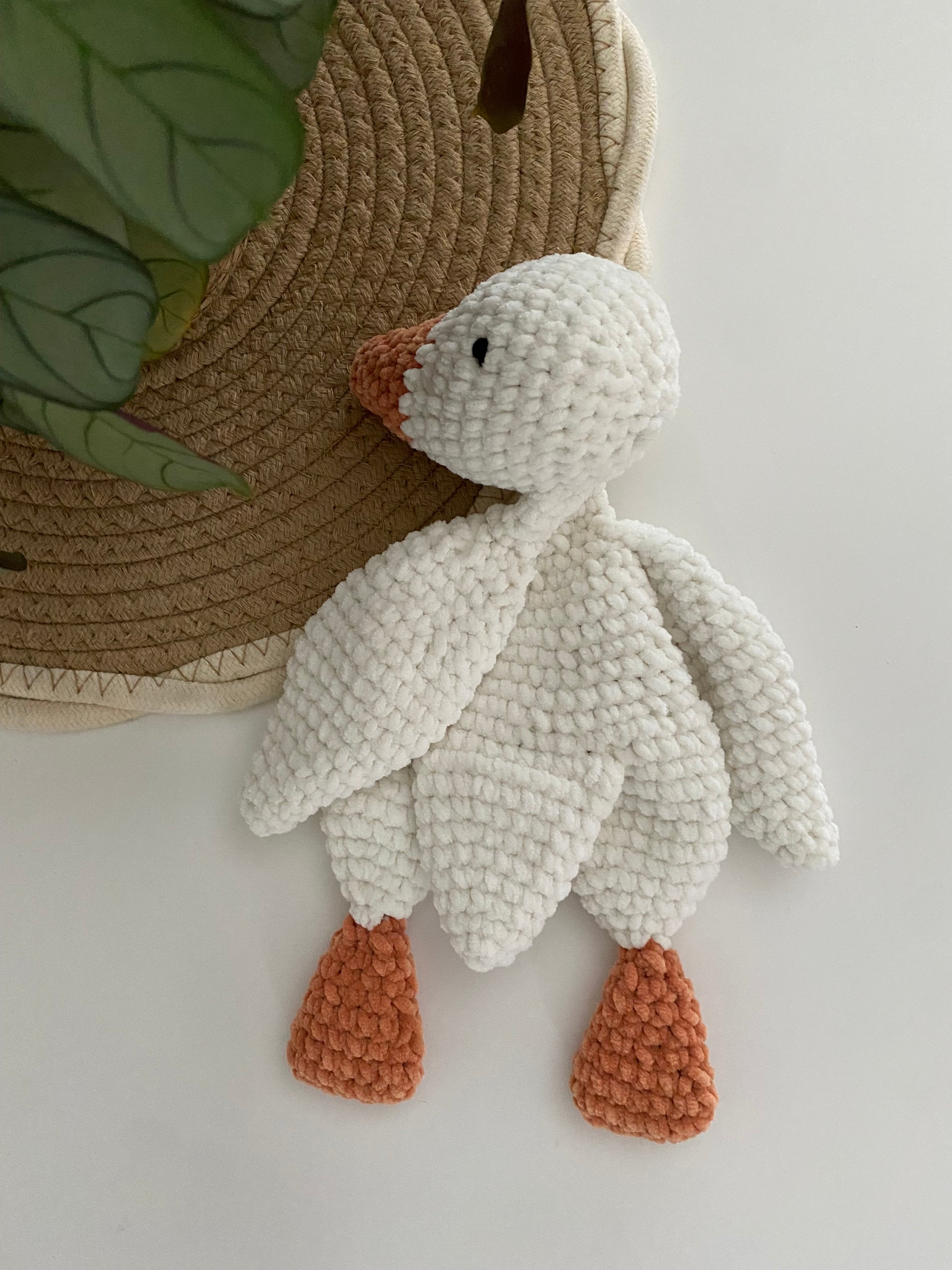 Dit lieve gehaakte knuffeldoekje in de vorm van een schattig gansje is gemaakt om eindeloos te knuffelen. Gemaakt van heerlijk zacht garen, voelt het doekje fluweelzacht aan en biedt het troost en geborgenheid voor je kleintje. Het lieve gansje nodigt uit tot knuffelen, vasthouden en dutjes doen, en wordt al snel een onmisbaar vriendje. Perfect als eerste knuffeltje, voor in bedje of onderweg, een zacht maatje om overal mee naartoe te nemen.