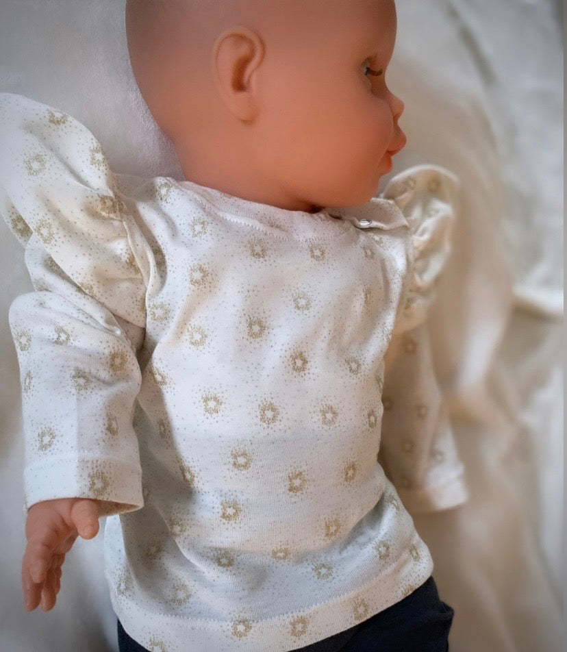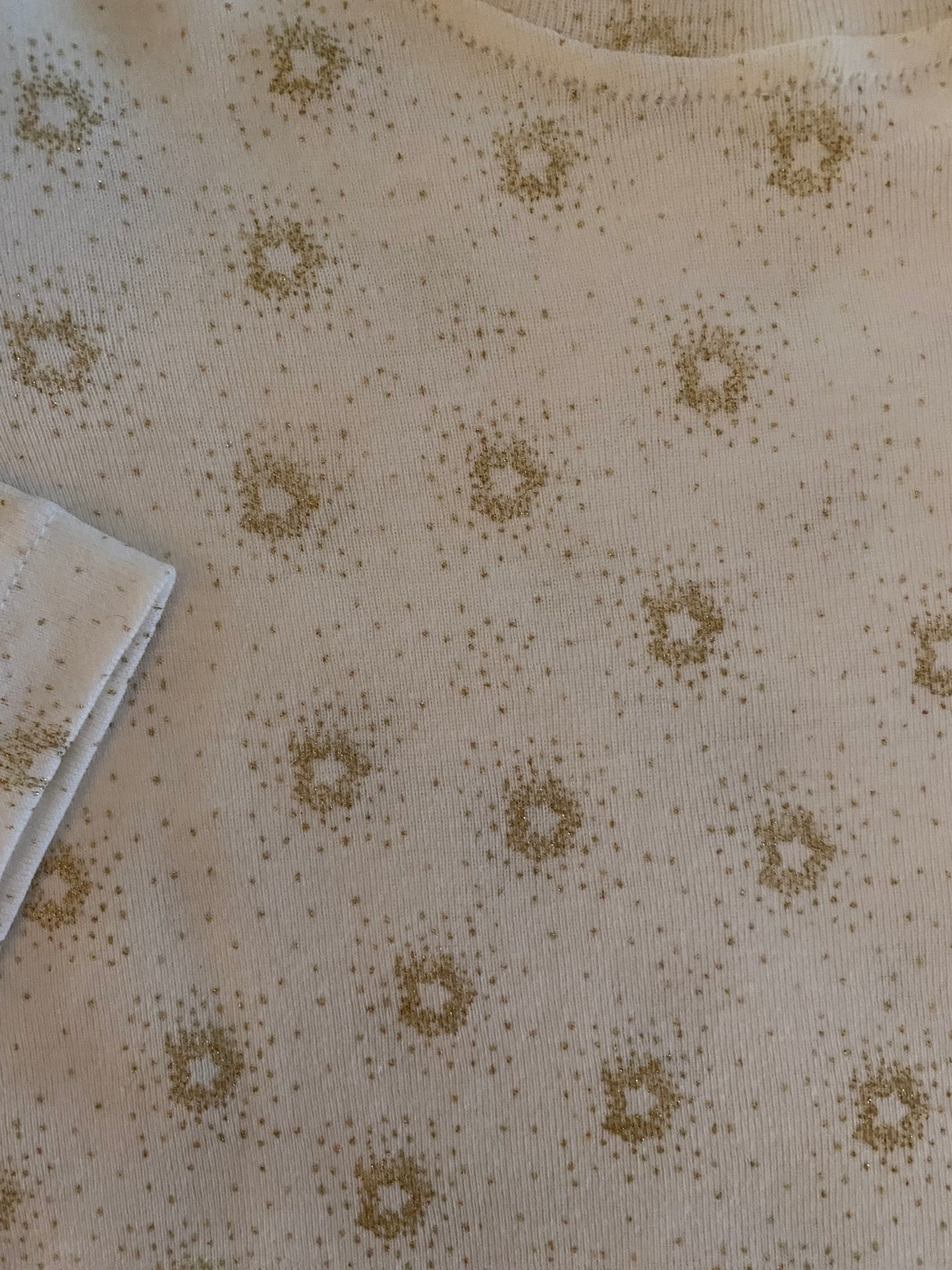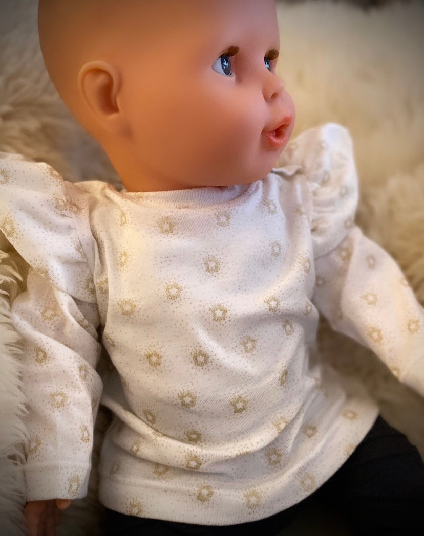 Deze betoverende meisjes longsleeve is een droom voor elke kleine prinses! Gemaakt van zachte witte katoenen tricot stof, biedt het ultiem comfort voor de hele dag. De delicate rushes aan de mouwen geven een extra vleugje charme en elegantie, terwijl de kleine glitter sterretjes die over de stof zijn verspreid, een magische glans toevoegen. Perfect voor feestelijke gelegenheden of gewoon om elke dag speciaal te maken, deze longsleeve laat je kleintje stralen als een ster. Een prachtige keuze voor een schattige, sprankelende look die de fantasie van je kleine meid tot leven brengt!