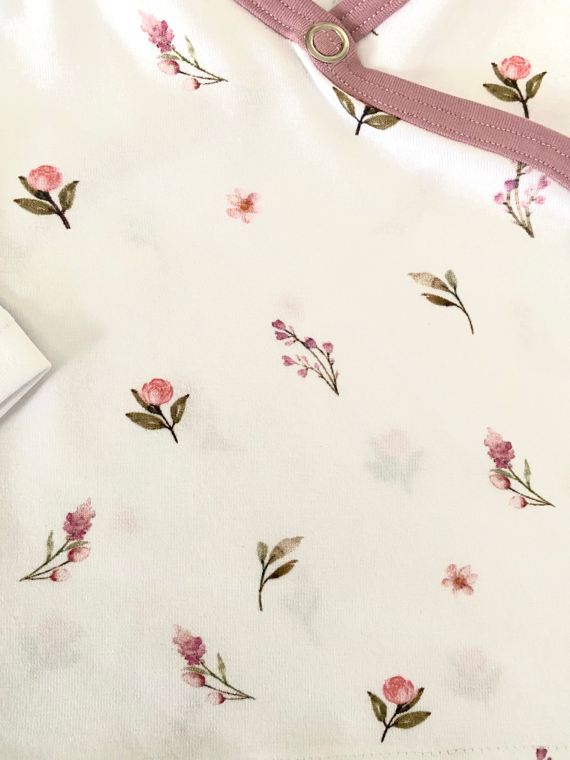Dit lieve newborn overslag shirtje is een echt schatje voor je kleine meisje! Het is bedrukt met piepkleine roosjes en blaadjes, wat zorgt voor een zachte en romantische uitstraling. Het roos biaisboordje geeft het shirtje een extra charmant en sierlijk detail. Dankzij het handige overslagmodel is het gemakkelijk aan en uit te trekken, ideaal voor de allerkleinsten. Een superschattig shirtje waarin je baby er betoverend uitziet én heerlijk comfortabel voelt!