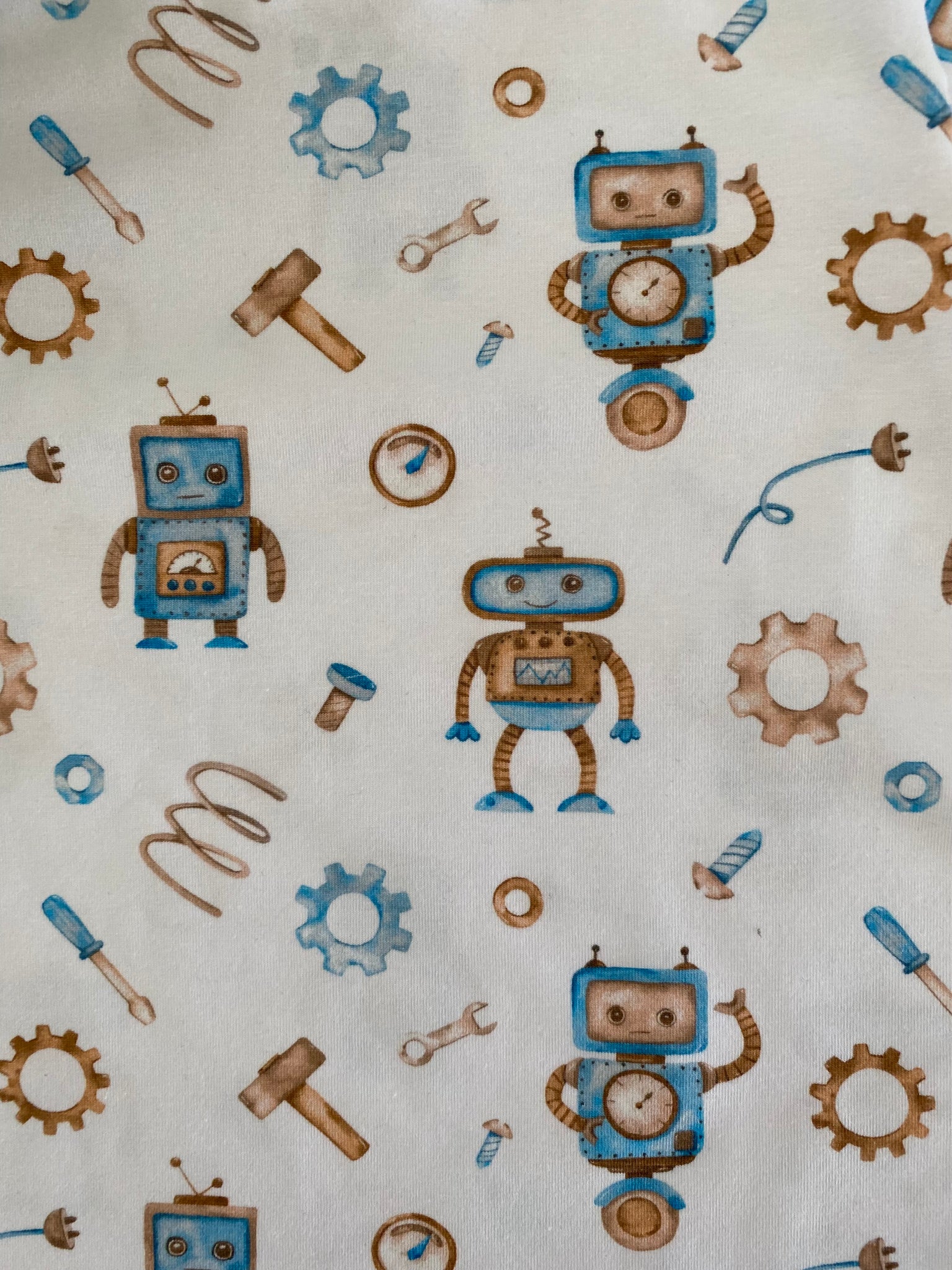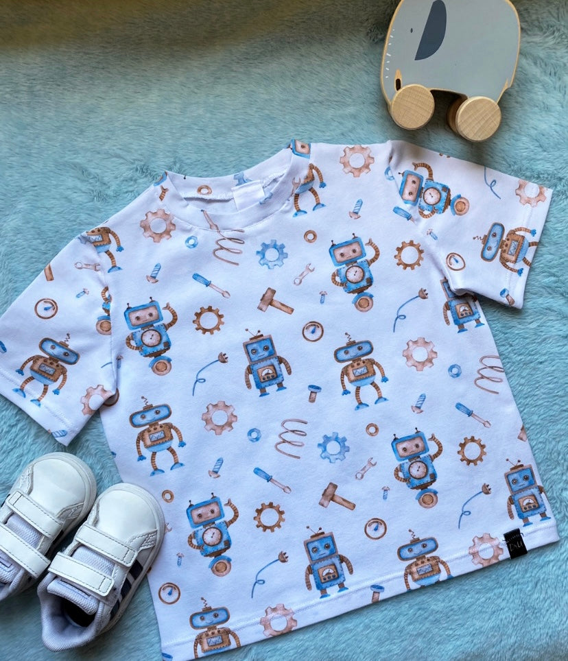 Laat je kleintje stralen met dit stoere jongens t-shirt, gemaakt van stevige witte katoenen tricot stof die perfect is voor elke actievolle dag. Bedrukt met speelse robotjes die met hun coole, futuristische uitstraling een flinke dosis avontuur en plezier toevoegen, maakt dit t-shirt elke outfit extra spannend. De robots lijken bijna tot leven te komen met hun gedurfde moves en vrolijke gezichten. Ideaal voor jonge ontdekkingsreizigers die graag de sterren van de show zijn, dit t-shirt biedt zowel stijl als comfort voor elke speelse en stoere gelegenheid!